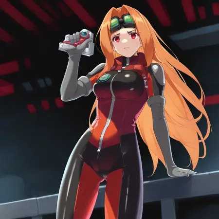 red eyes, orange hair, long hair, goggles, goggles on head,