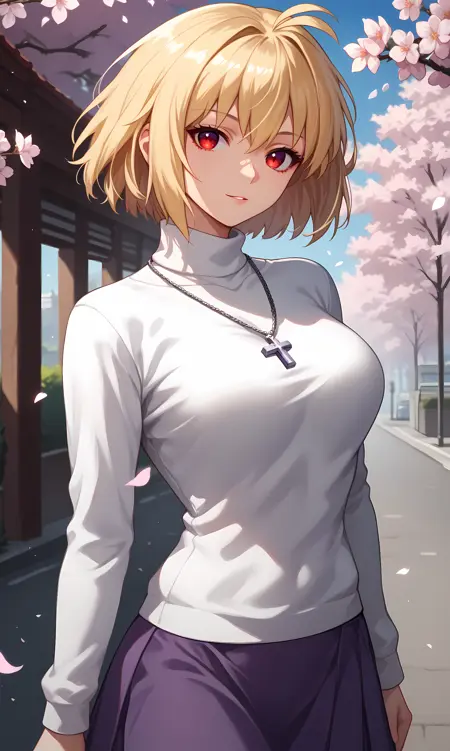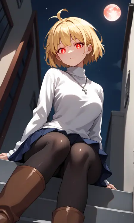 白色毛衣,高领,长袖,十字架项链,蓝色裙子,百褶裙,黑色丝袜,迷你裙,棕色鞋子,靴子