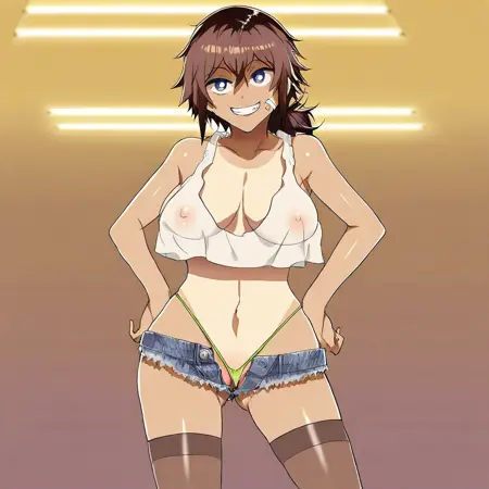 onna_tomodachi,古铜色皮肤,晒痕,凌乱低马尾,杂乱刘海,