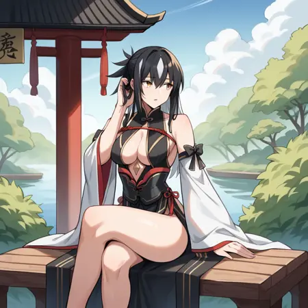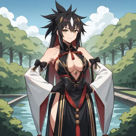 Keget_Fin、黒髪、スパイクヘア、センター開き、胸元カットアウト、衣装カットアウト、黒いドレス、スパイクヘア、ハーラードレス、黒いサッシュ、赤い胸ストラップ、黒い手袋、取り外し可能な袖、裸の肩、白い袖、広い袖、長袖、黒いリボン、長いスカート、白いスカート、黒いスカート、