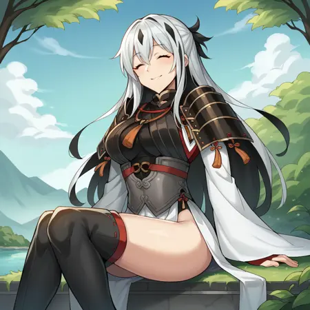 Keget_Def、白髪、黒いレオタード、レオタード、グレーのコルセット、アンダーバスト、白いスカート、オレンジ色のロープ、肩アーマー、長袖、白い袖、広い袖、指先部分が開いた手袋、ヒップベンツ、黒いパンツ、オレンジ色の房飾り、ジュエリー、タートルネック、アーマー、