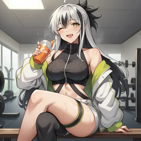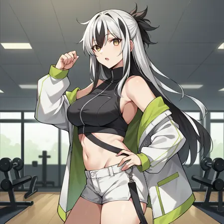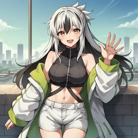Keget_Alt,白发,马尾,短上衣,黑衬衫,替代高领,拉链,露肩夹克,无袖衬衫,白夹克,绿色镶边,白色短裤,超短裤,黑色肩带,大腿绑带,单侧长筒袜,替代长筒袜,黑色长筒袜,