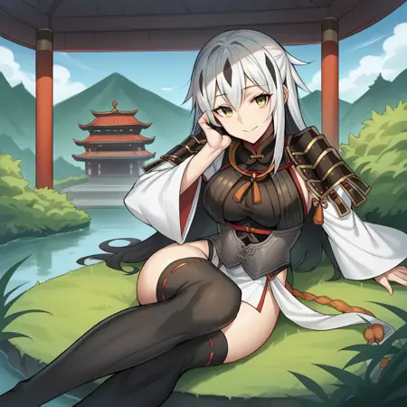 Keget_Def,白发,黑色紧身衣,紧身衣,灰色束腰,胸下束腰,白裙,橙色绳索,肩甲,长袖,白袖,宽袖,部分露指手套,髋部开叉,黑色内裤,橙色流苏,饰品,高领,盔甲,