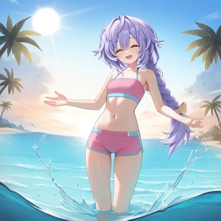 PlutNep, Fol002, Plt_Swm, 긴 머리, 연보라 머리, 보라색 눈, pururut, 땋은 토끼 꼬리, 해머 뷰키 상의, 분홍 수영복, 파란 줄무늬, 수영복 하의,
