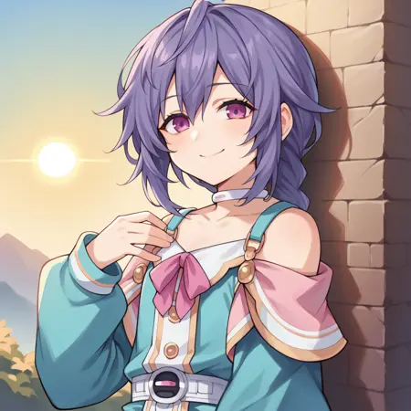 PlutNep, Fol001, Plt_Adv, pururut, 연보라 머리, 보라색 눈, 긴 머리, 땋은 토끼 꼬리, 십자 끈 매듭 옷, 검은 베스트, 짧은 베스트, 빨간 리본, 십자 펜던트, 흰색 블라우스, 퍼프 짧은 소매, 흰색 소매, 소매 벨트, 소매 슬릿, 느슨한 벨트, 갈색 벨트, 벨트 주머니, 갈색 손목 보호대, 금색 팔찌, 줄무늬 허벅지 양말, 검은 허벅지 양말, 파란 허벅지 양말, 더하기 기호 무늬, 허리 앞치마, 빨간 치마, 프릴 치마, 검은 리본, 머리 리본, 진한 파란색 머리장식, 베레모, 연갈색 신발, 무릎 부츠,