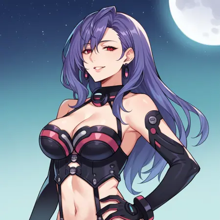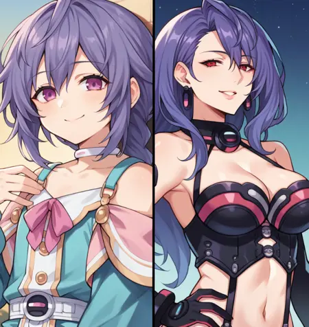 PlutNep, Fol003, Plt_Iris, 아이리스 하트, 빨간 눈, 보라색 머리, 파란색 머리, 그라데이션 머리, 한쪽 귀걸이, 크롭탑, 해머넥, 터틀넥, 가슴 커트아웃, 검은 코르셋, 스트랩, 검은 팬티, 허벅지 커트아웃, 가터 스트랩, 허벅지 부츠, 검은 신발, 하이힐 부츠, 마젠타 테두리, 검은 장갑, 검은 팔찌, 긴 장갑, 배꼽, 도미나트릭스,