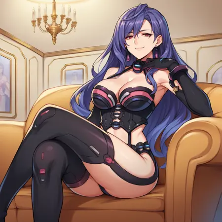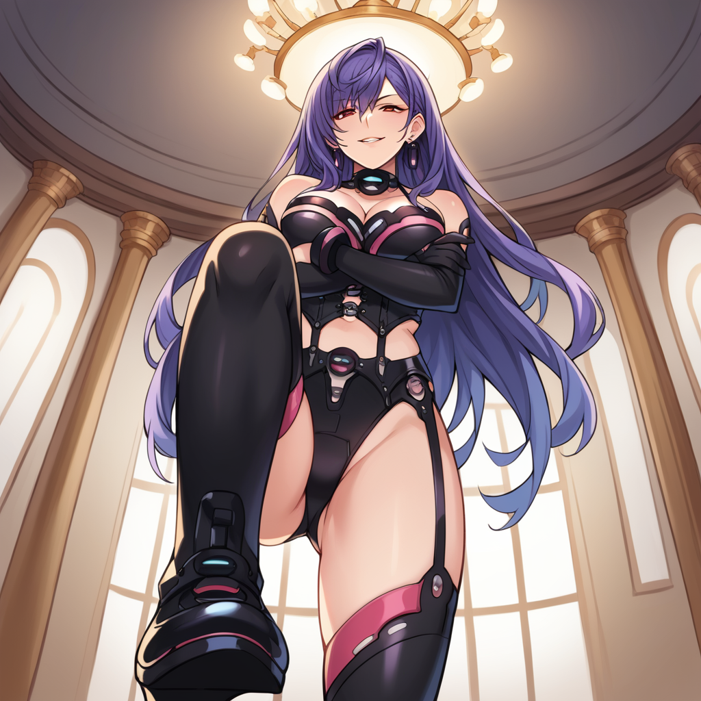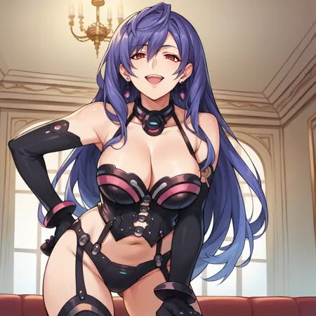 검은 코르셋, 코르셋, 상복부, 보석, 가슴 노출, 해머넥, 보라색 테두리, 분리된 칼라, 분리된 소매, 긴 소매, 검은 소매, 검은 장갑, 팔찌, 스트랩, 가터 스트랩, 검은 팬티, 검은 허벅지 양말, 대안 허벅지 양말, 귀걸이,