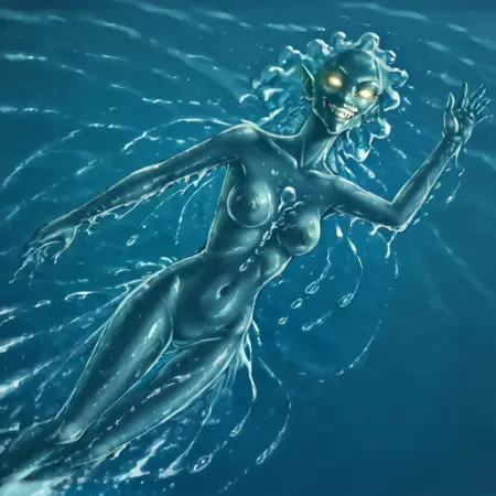 Siren, 1girl, glowing eyes, smile, parted lips, fangs solo, alluring, seductive, translucent, ethereal, water-based character, fluid body, translucent, fluid body, see-through:1.2