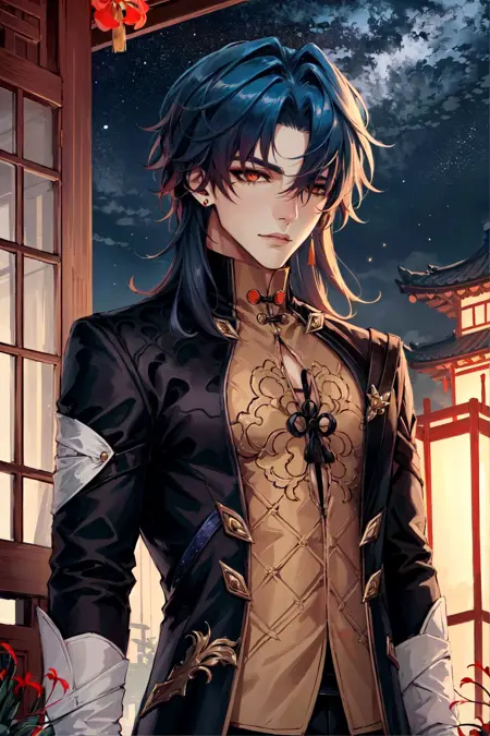 optional tags: male focus, black coat, chinese clothes, bangs,
