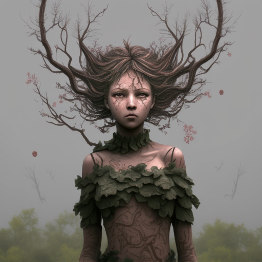 腕にはツタが巻きつき、肌から花が咲き、人間の美しさと自然の神秘的な要素が融合した、まるで異次元的な雰囲気が現れます。