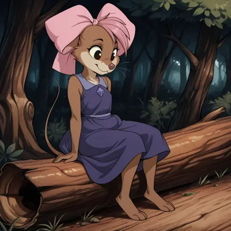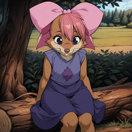 teresabrisbyil, semi-anthro, female, mouse girl, brown fur, whiskers, pink hair bow, purple dress, sleeveless,