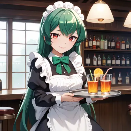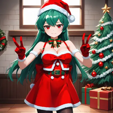 Magical Girl Uniform : minakami sayo, red eyes, green hair, long hair, magical girl, hair bow, blue bow, blue dress, blue bowtie, puffy short sleeves, white sleeves, elbow gloves, blue gloves, blue skirt, high-waist skirt, frilled skirt, thigh boots, blue footwear,