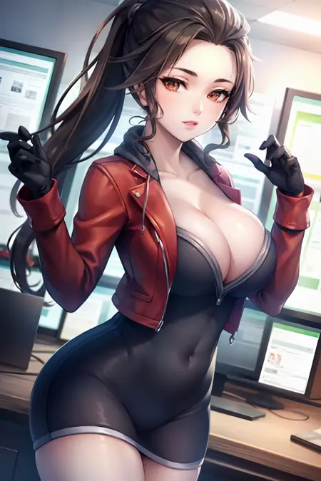 기본 의상은 보스아이, 장갑, 검은 드레스, 볼륨 있는 가슴, 빨간 자켓, 쌈지머리 입니다.