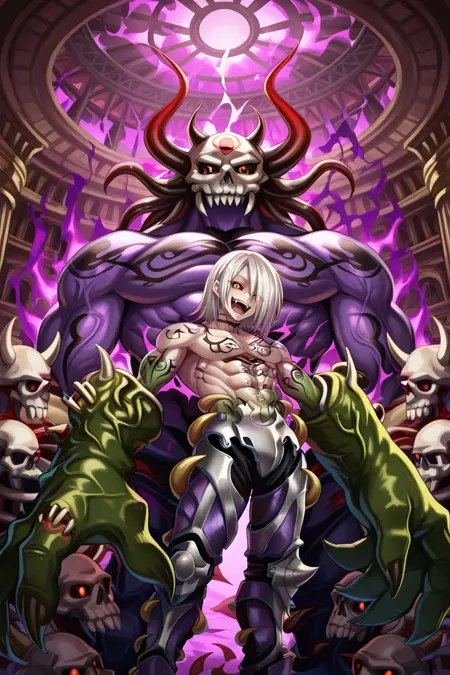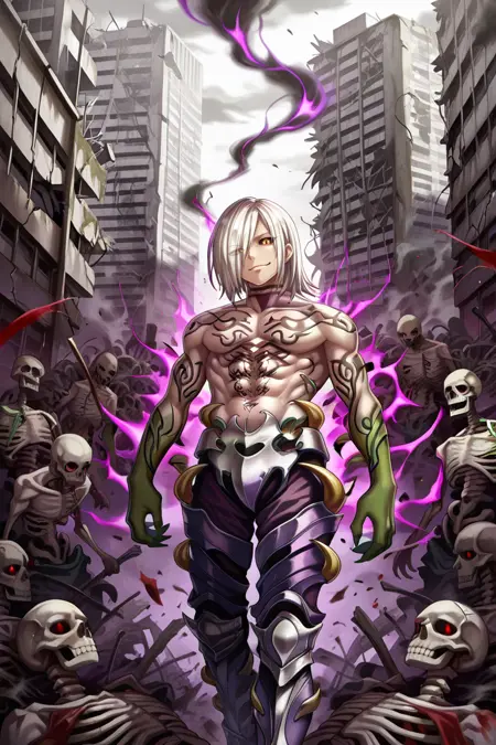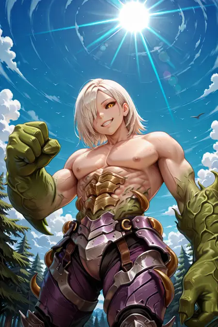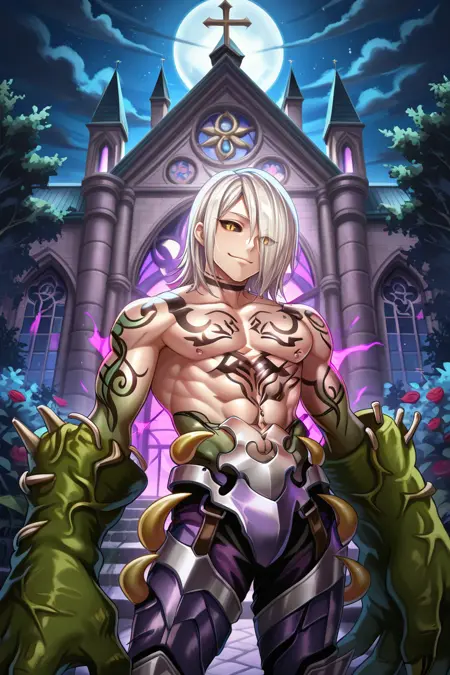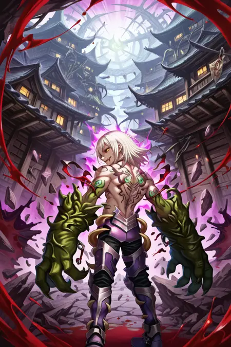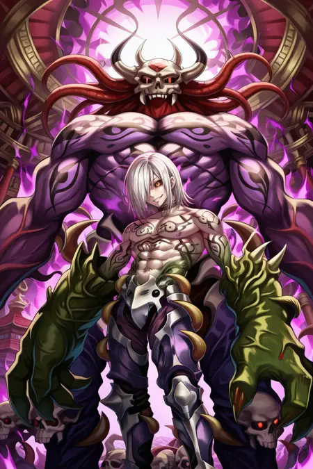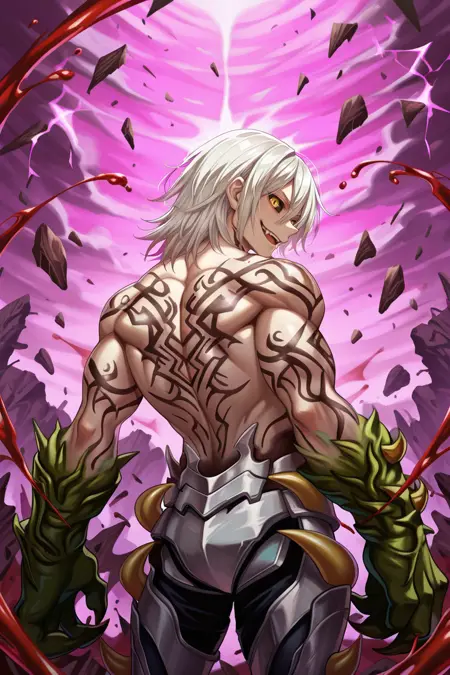 役立つタグ: 1boy, yellow eyes, black sclera, white hair, short hair, hair over one eye, topless male, green hands, oversized limbs, tattoo, crotch plate, armored legs, armor, purple footwear