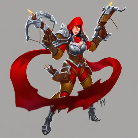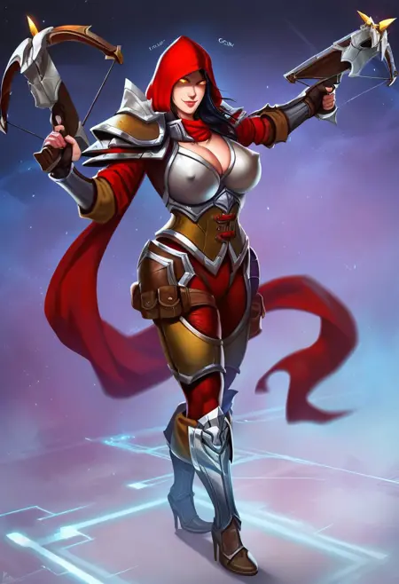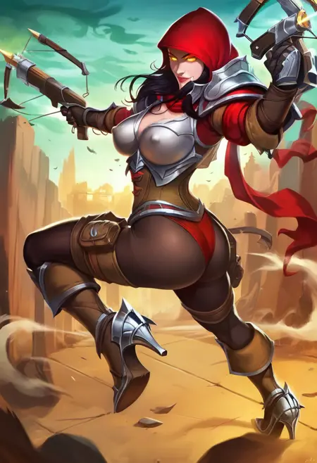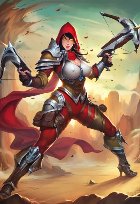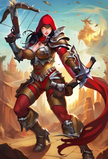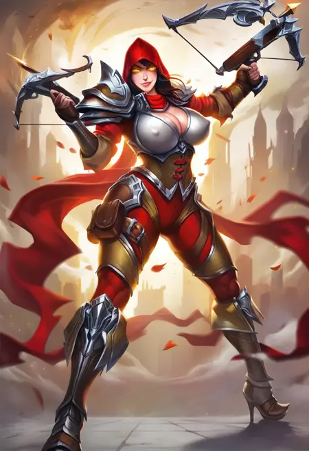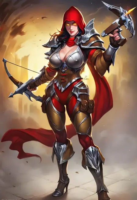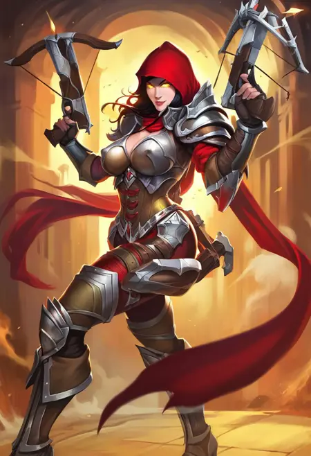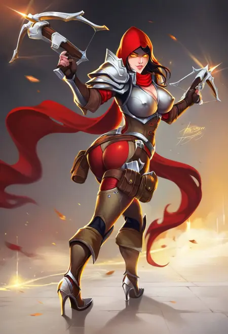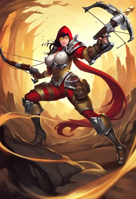 VallaHotS,1girl,solo,黒髪,黄色い目,肩甲板,アーマー,武器,赤いフード,ブーツ,赤いスカーフ,胸元,ハイヒール,クロスボウ,手袋,光る目,矢筒,パウルドロン,胸甲,唇,ブレイサー,ぴったりした服,大きな胸