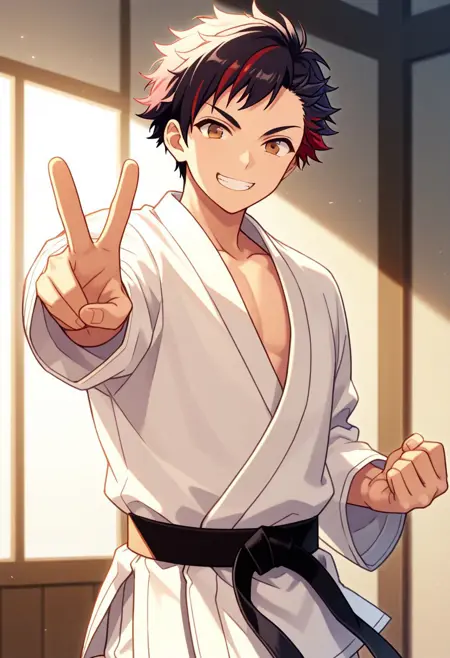 tetonagu, 1boy, male focus, solo, brown eyes, black hair, red hair, multicolored hair, streaked hair, ryuseitai uniform, shirt, black shirt, jacket, black jacket, zipper pull tab, partially unzipped, long sleeves, gloves, black gloves, fingerless gloves, belt, black belt, star (symbol), pants, black pants, boots, white footwear,