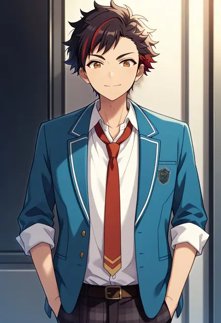 nagumo, 1boy, male focus, solo, black hair, red hair, multicolored hair, streaked hair, red eyes, school uniform, shirt, white shirt, necktie, red necktie, jacket, blazer, blue jacket, plaid, pants, plaid pants, shoes, brown footwear,