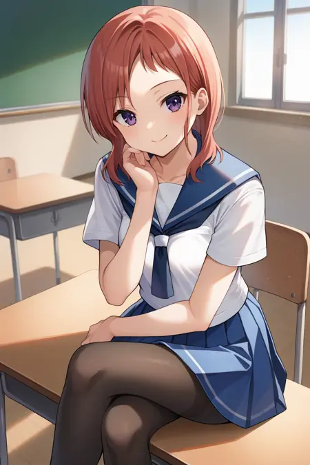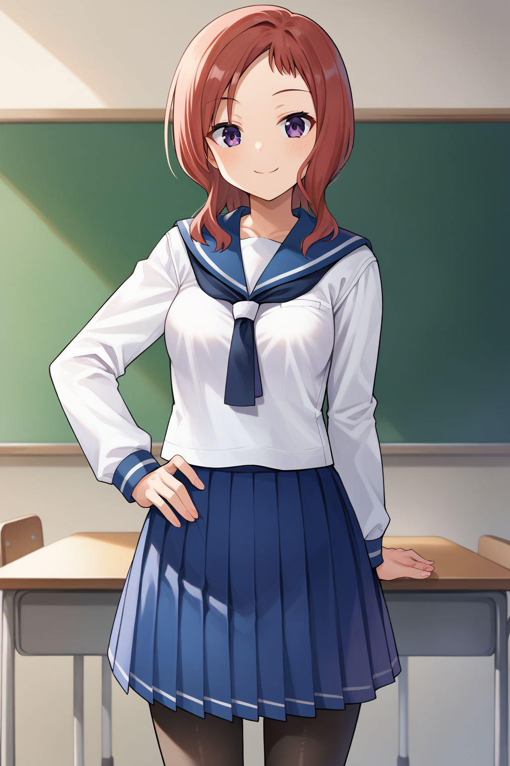 hisatakei, 1girl, solo, red hair, medium hair, purple eyes, medium breasts, school uniform, serafuku, white shirt, long sleeves, blue sailor collar, blue neckerchief, blue skirt, pleated skirt, black pantyhose