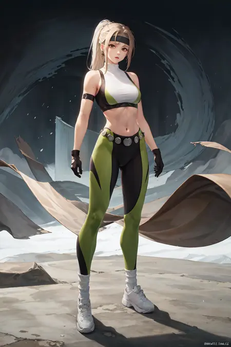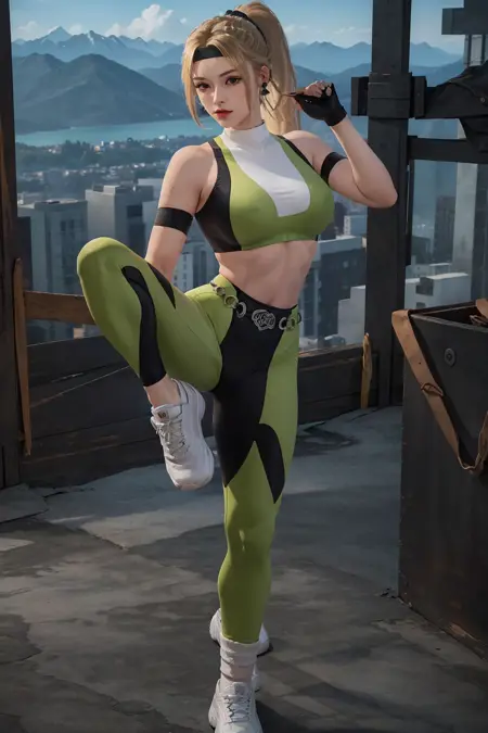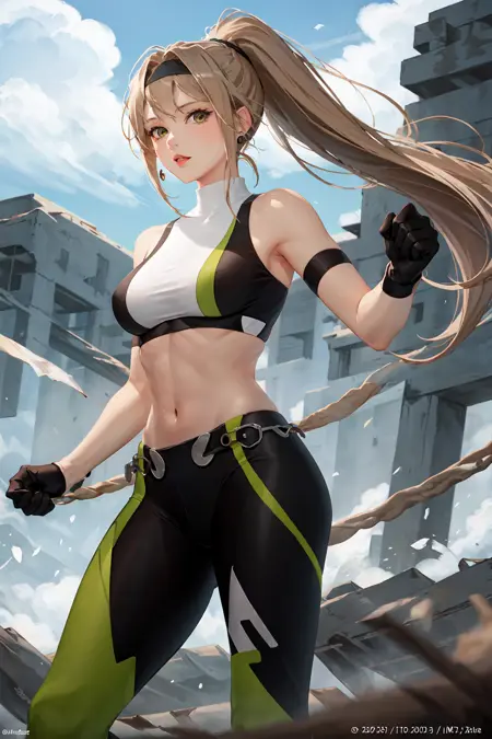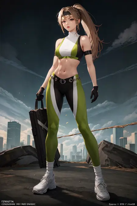 장갑, 헤드밴드, 바지, 단추 모양 머리끈, 초록색 스타킹, 검은 장갑, 큰 가슴, 긴 머리카락, 스포츠 브라, 귀걸이, 갈색 머리카락, 복부 노출, 악세서리, 흰색 양말, 흰색 신발, 로프, 복부 중심, 흰색 양말, 탄력 있는 몸매