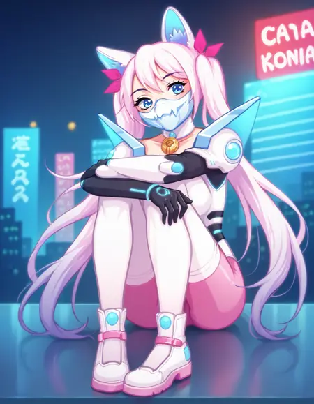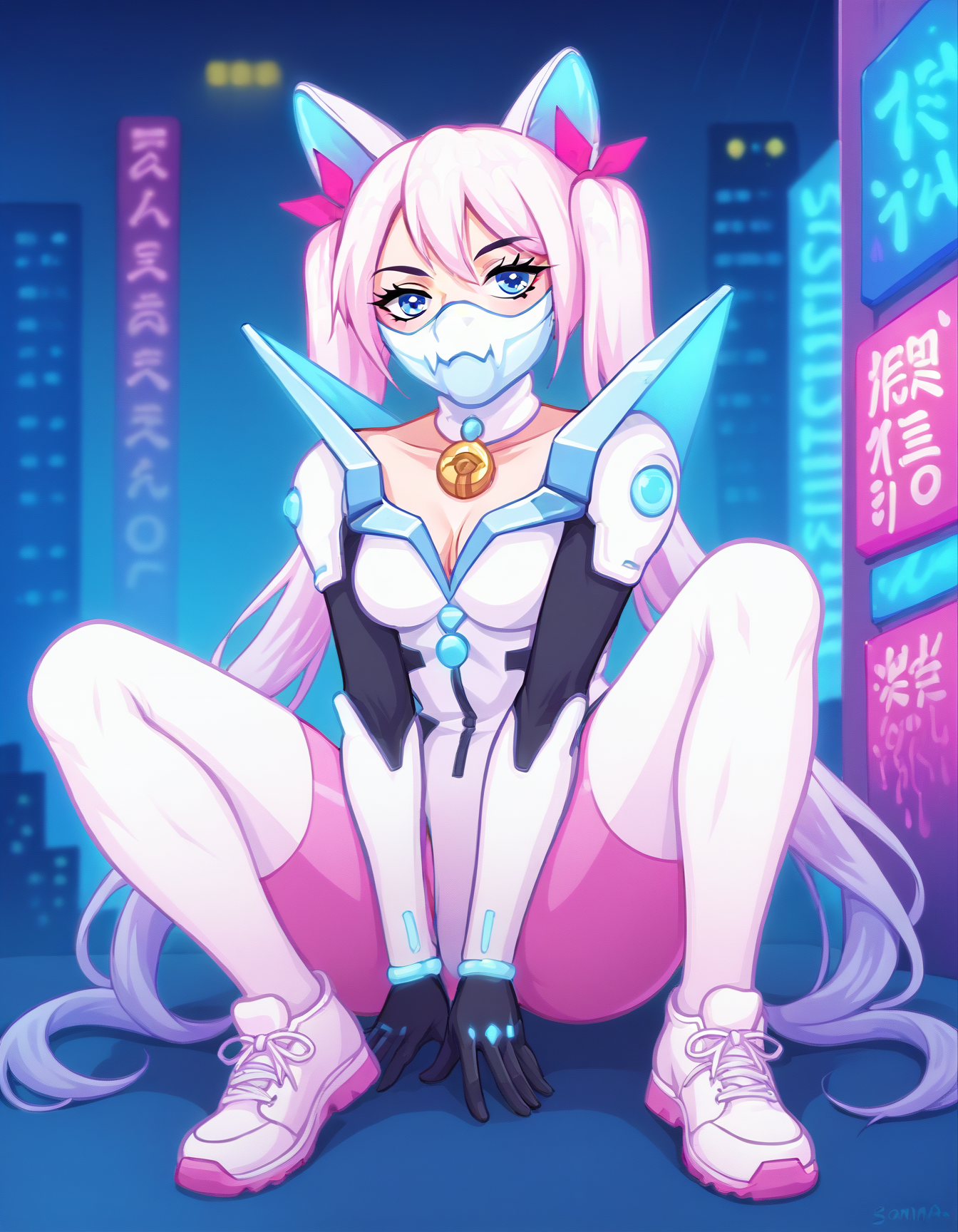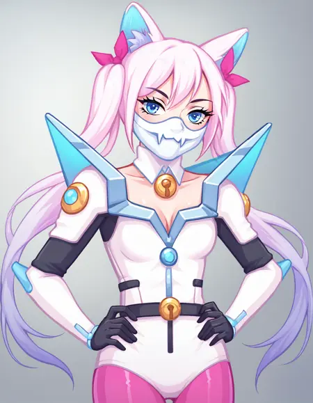 プロンプト: Sonna_Mun, ソロ, 黒い手, ピンクの髪, 白いマスク, 二つのポニーテール, 動物の耳, 青い目, 黒い手袋, 首にゴールドのペンダント、白いスーツ、ピンクのレギンス、白いストッキング、ショルダーパッド。