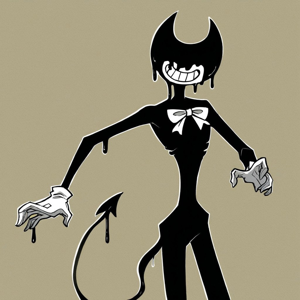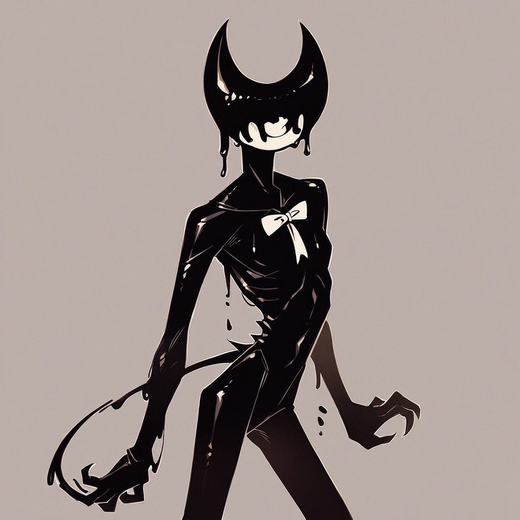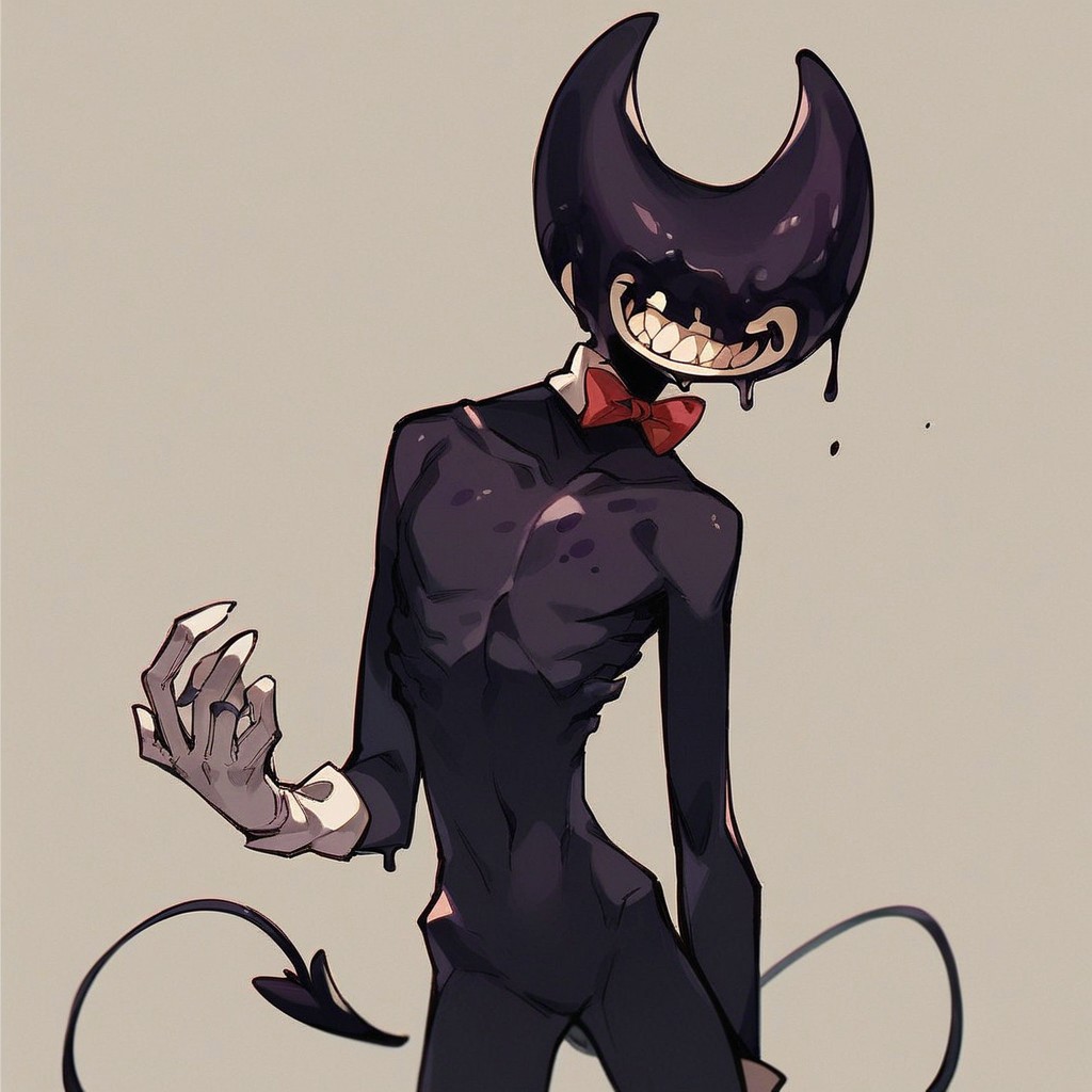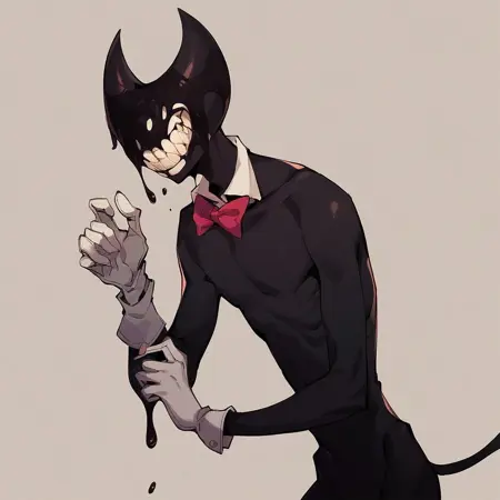 Tags: Ink bendy, standing, demon, horns, bow tie, demon tail, grin, smiling, teeth, tall, slender, skinny, skeletal body, visible rib cage, black skin, ink drips, black ink drips, Sharp claw, gloves