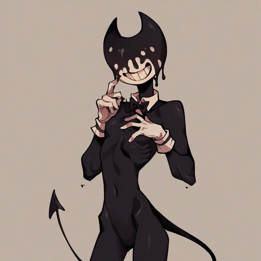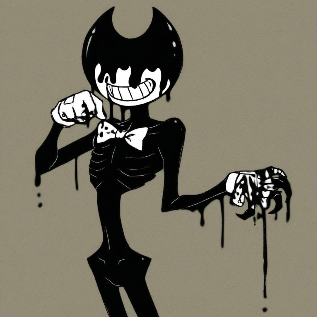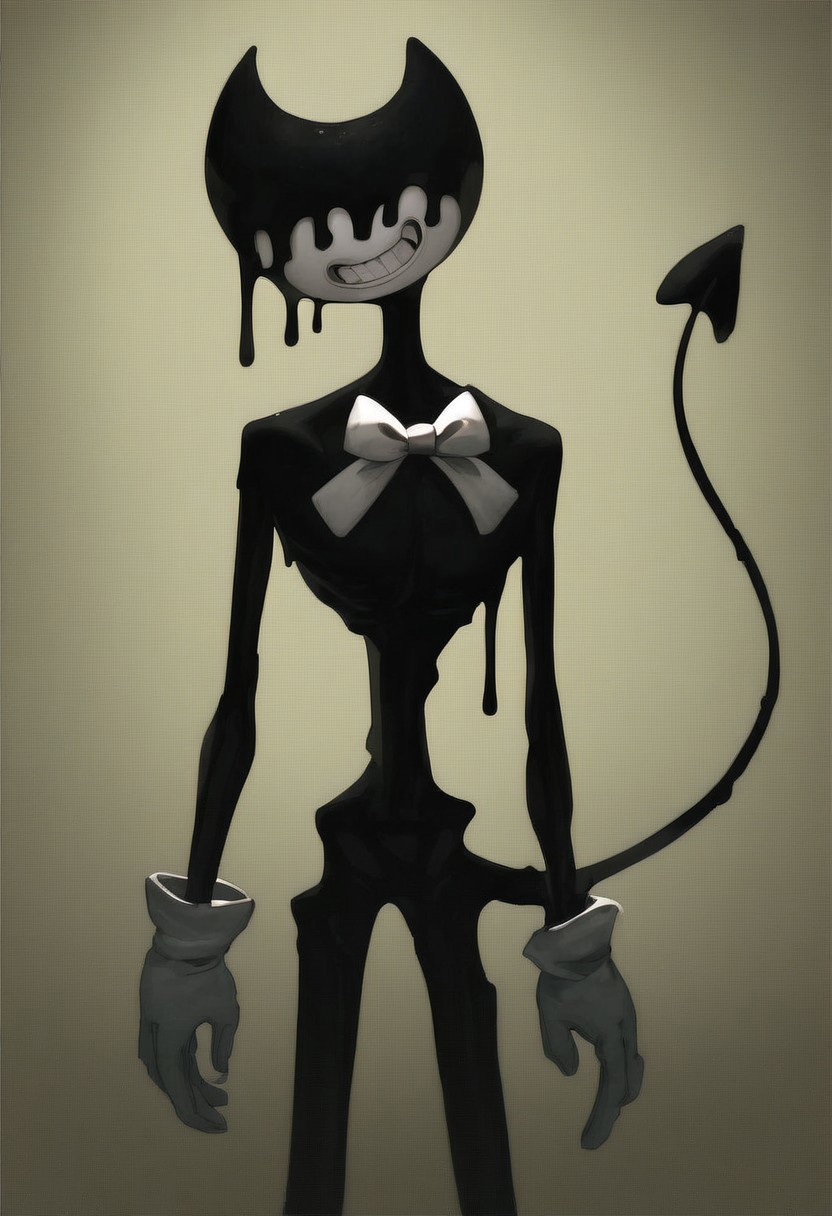Tags: Ink bendy, standing, demon, horns, bow tie, demon tail, grin, smiling, teeth, tall, slender, skinny, skeletal body, visible rib cage, black skin, ink drips, black ink drips, Sharp claw, gloves