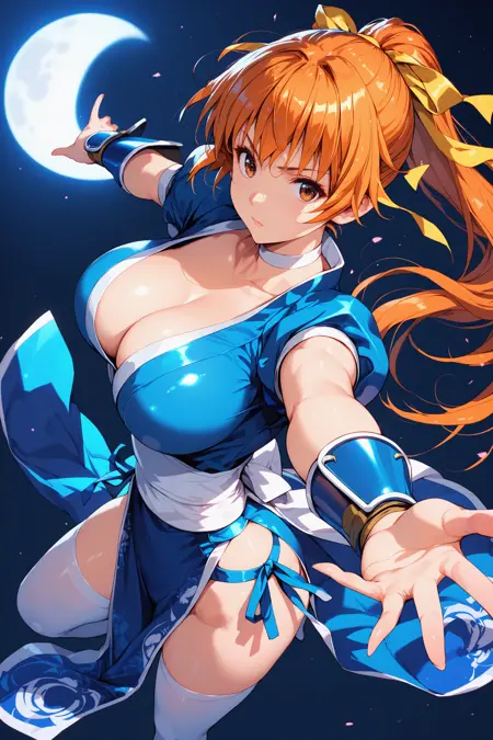 트리거 단어: ceiiai kasumidoa, 꼬리머리, 앞머리, 주황색 머리, 갈색 눈, 큰 가슴, 파란색 옷, 목걸이, 흰색 목걸이, 가슴선, 파란색 골반 커튼, 파란색 끈, 측면 매듭 끈, 허벅지 양말, 흰색 허벅지 양말, 짧은 소매, 팔 보호대, 머리 끈, 풍성한 짧은 소매, 노랑색 끈, 흰색 띠, 팔 벗어짐, 파란색 소매, 파란색 일본 옷, 신발