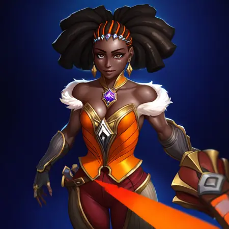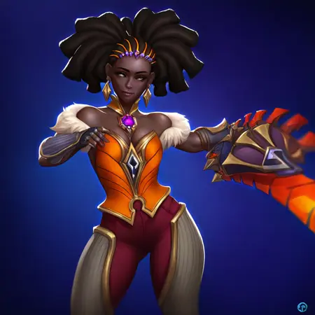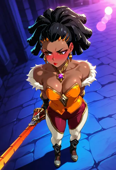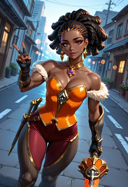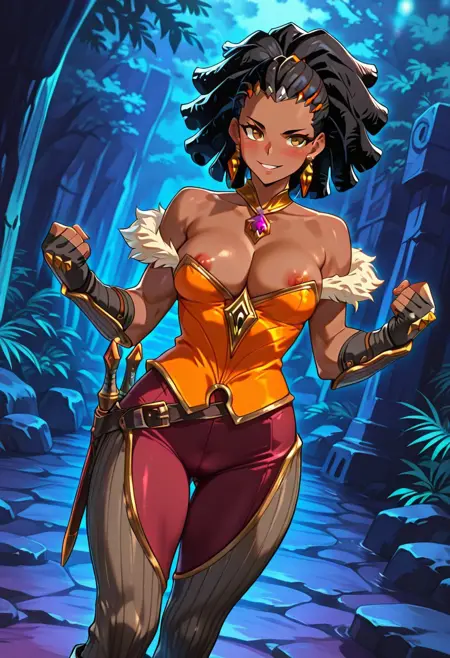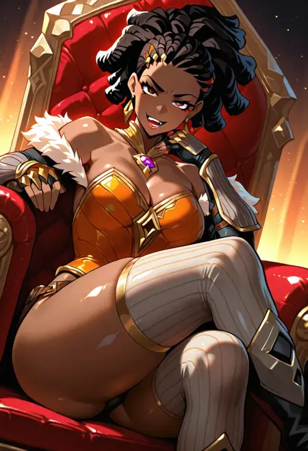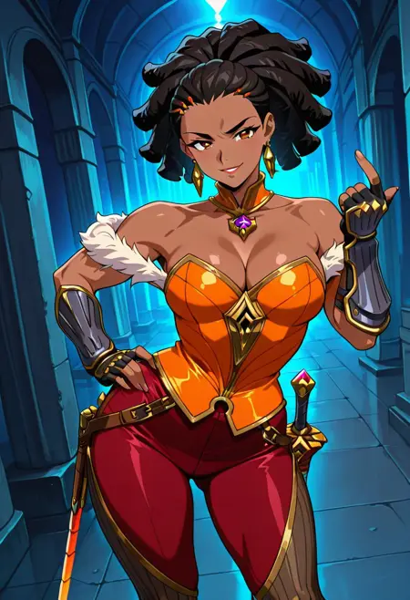 QhiraHoTS, 1소녀, 솔로, 검은 피부, 검은 피부를 가진 여성, 곡선이 있는 신체, 검은 머리, 머리 장식, 덩어리 머리, 머리클립, 귀걸이, 갈색 눈, 두꺼운 입술, 드러난 어깨, 흰 털 장식, 큰 가슴, 가슴 사이, 보석이 달린 목걸이, 주황색 코르셋, 큰 엉덩이, 두꺼운 허벅지, 보석, 손가락 없는 장갑, 겐틀렛, 브레이서, 빨간 바지, 줄무늬 허벅지 양말, 부츠, 체인 검,