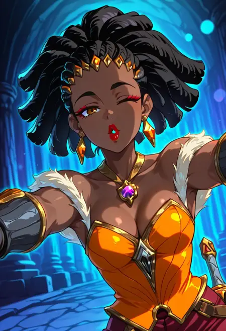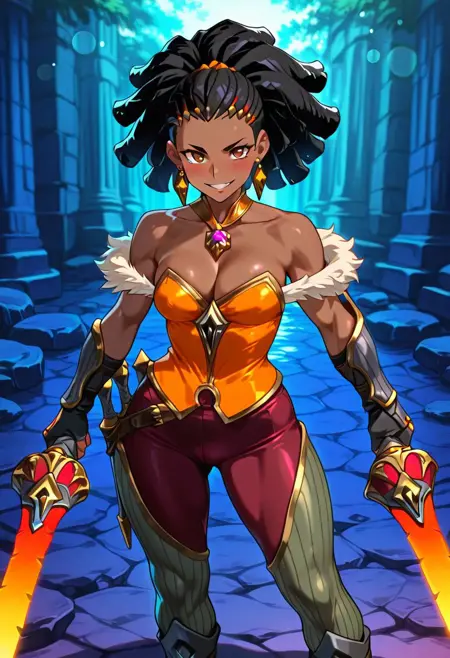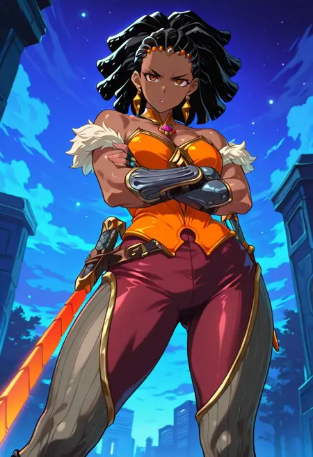 QhiraHoTS, 1girl, ソロ, 暗い肌, 暗い肌の女性, 曲線的な体型, 黒髪, 髪飾り, ロックヘア, ヘアクリップ, ピアス, 茶色の目, 厚い唇, 肩出し, 白い毛皮のトリム, 大きな胸, 胸元, 宝石のネックレス, オレンジ色のコルセット, 大きな臀部, 厚い太もも, ジュエリー, 指なし手袋, ガントレット, ブレイサー, 赤いズボン, 縞模様の太ももハイ, ブーツ, チェーンソード,