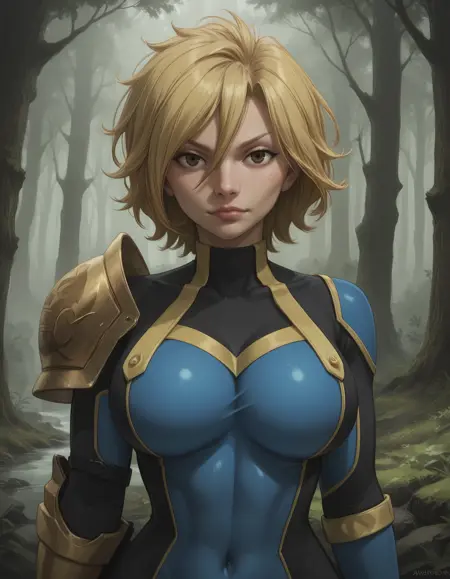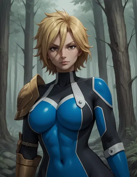 1. 连体衣:蓝色连体衣,紧身,肩甲,蓝色膝靴