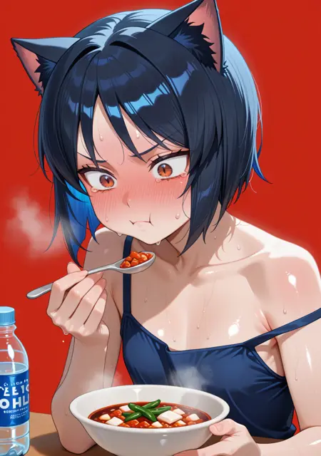 "kirasama, brown eyes, short hair,blue hair, black hair, cat ears"