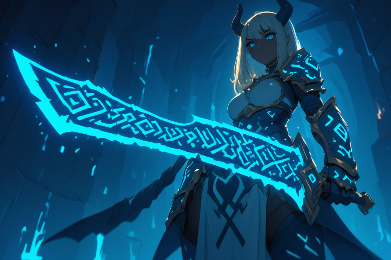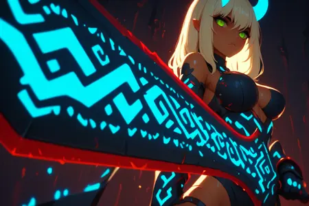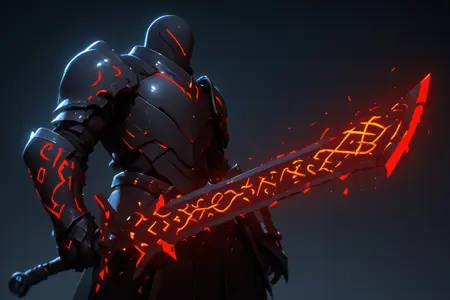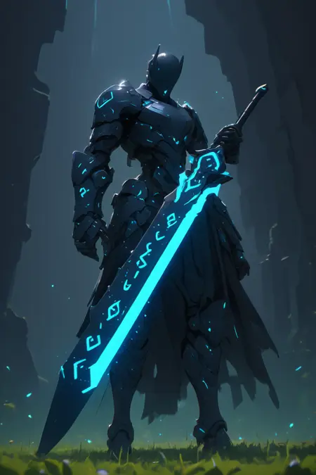 "score_9, score_8_up, score_7_up, upscale 2x,(A man in armor holding a sword, the blade is outlined in glowing green and had glowing symbols along the blade, dungeon in background, runesword, low angle view, close up focus on the sword:1.2)"