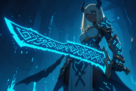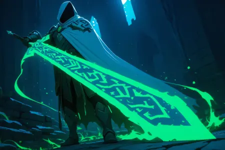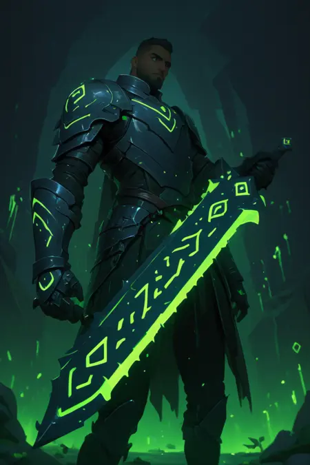 "갑옷을 입은 남자가 검을 들고 있다. 검날은 빛나는 녹색 선으로 둘러싸여 있으며, 검날에는 빛나는 상징이 있다. 배경은 지하 던전, runesword"
