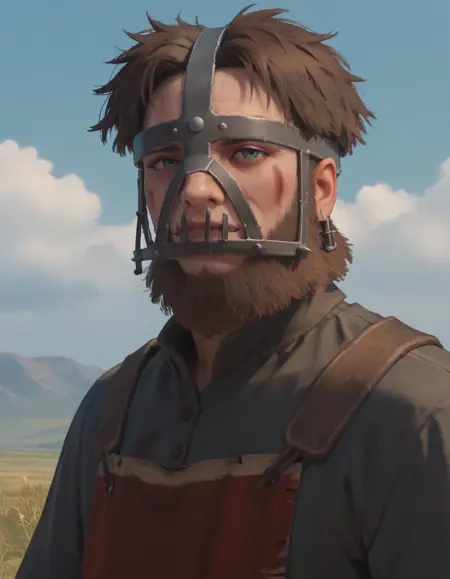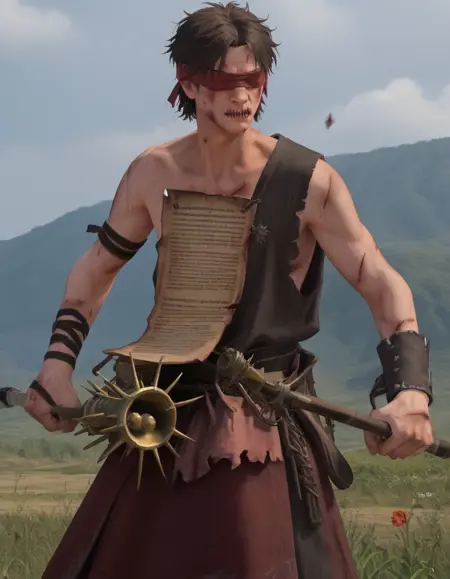 Flagellant, vest, scars, bloody, wounds, holding weapon,
