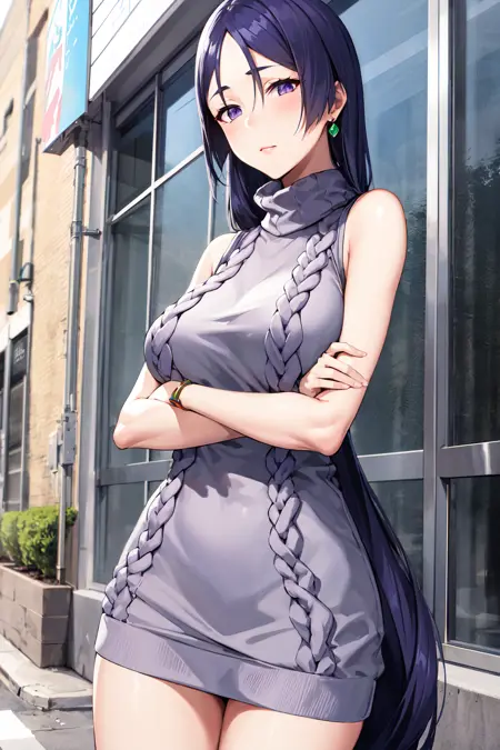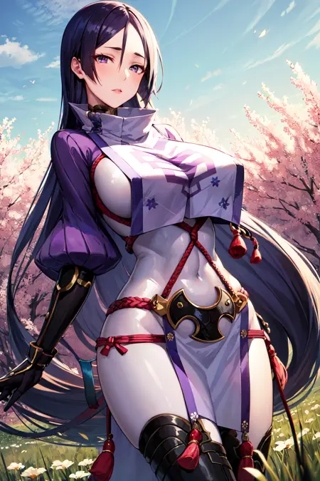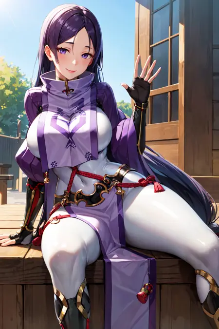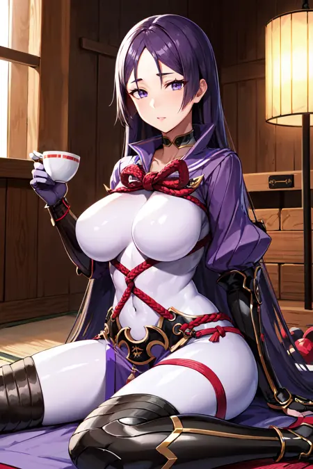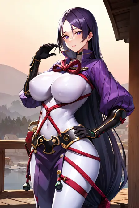 衣装1(ロインクロスなし)hmmr1, minamoto no raikou (fate), high collar, gloves, ribbed sleeves, rope, (purple bodysuit:1.2)