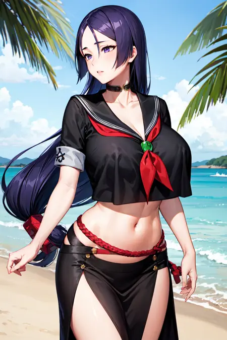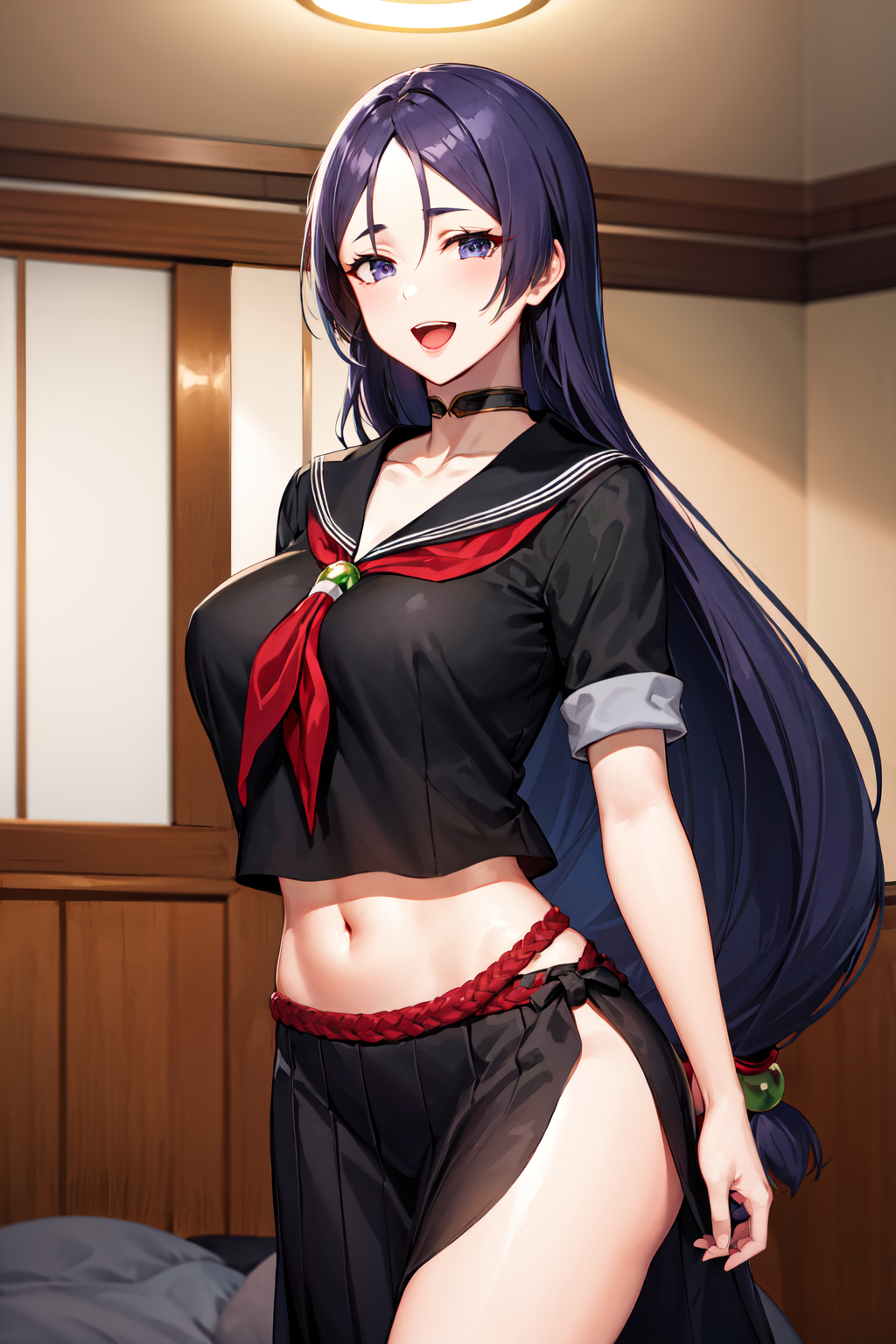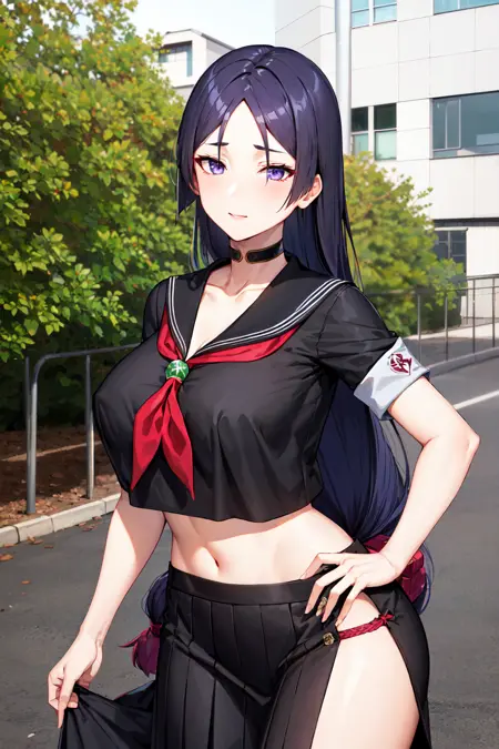 衣装3(学校制服)hmmr1, minamoto no raikou (fate), low-tied long hair, school uniform, black serafuku, black shirt, crop top, collarbone, neckerchief, midriff, long skirt, choker, side slit, sailor collar