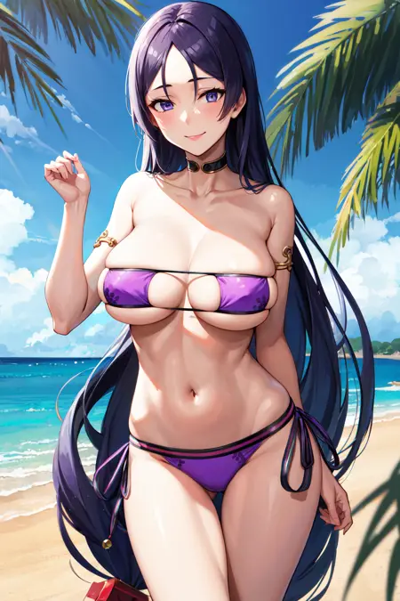 衣装2(ビキニ)hmmr1, minamoto no raikou (fate), eyepatch bikini, purple bikini, armlet, choker, beads, bare shoulders, ribbon, rope