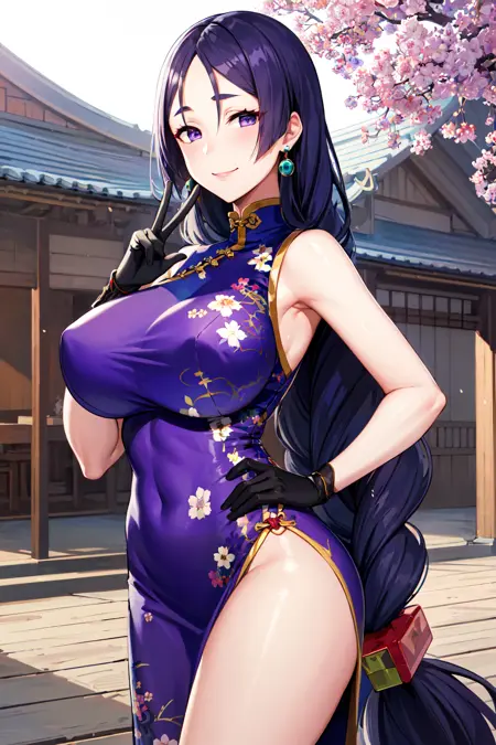 衣装4(中国服)hmmr1, minamoto no raikou (fate), dress, gloves, china dress, low-tied long hair, bare shoulders, earrings, jewelry, sleeveless, purple dress, side slit, purple gloves, floral print, hair ornament, braid