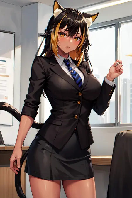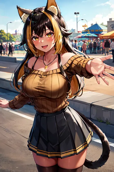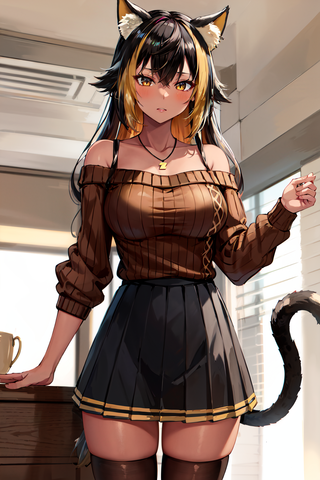 外装2hmnc1, 动物耳朵, 尾巴, 深色皮肤, 彩色头发, 黑色过膝袜, 落肩毛衣, 百褶裙, 黑色裙子, 饰品, 项链, 网眼毛衣, 锁骨露肩