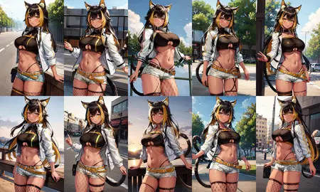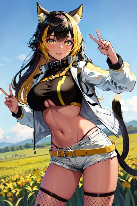 外装1hmnc1, 动物耳朵, 尾巴, 深色皮肤, 彩色头发, 开襟夹克, 白色夹克, 鱼网袜, 腰带, 不对称腿部服装, 短短的短裤, 腹部裸露, 白色短裤, 高腰内裤, 乳晕暴露, 服装镂空