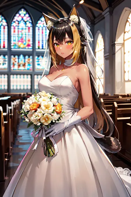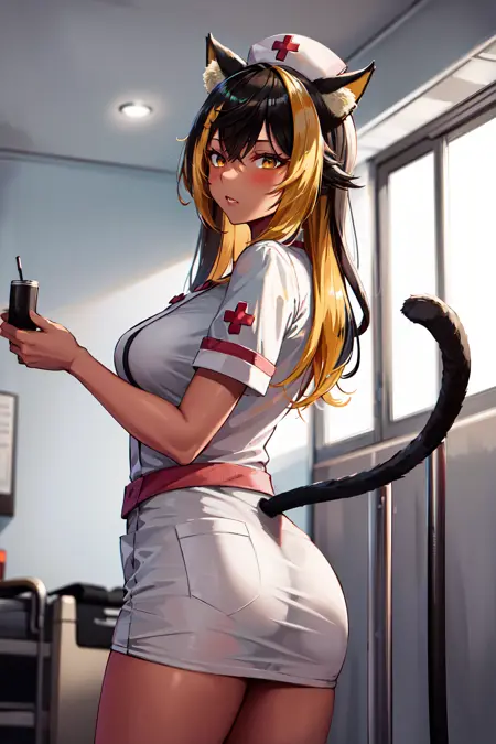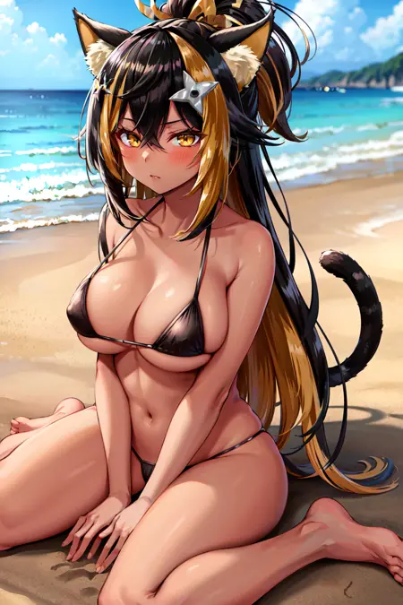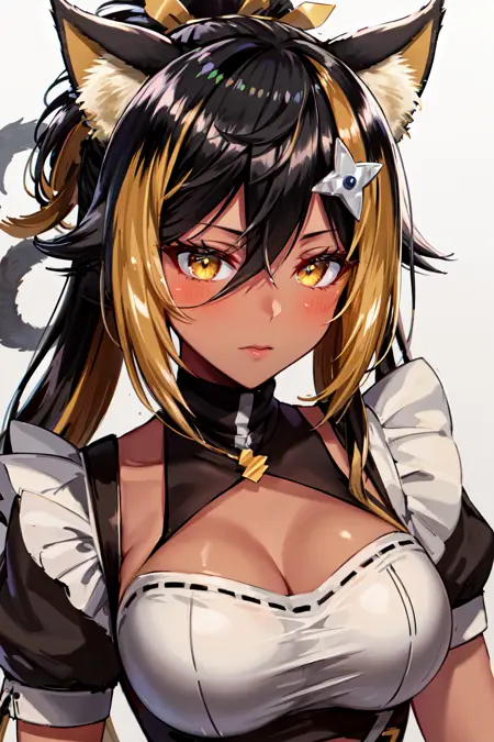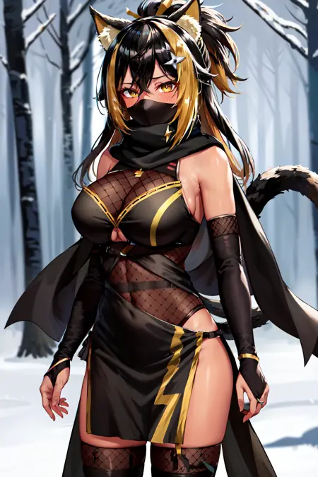 外装3hmnc1, 动物耳朵, 尾巴, 深色皮肤, 彩色头发, 忍者, 鱼网袜, 婚纱护手, 口罩, 黑色围巾, 马尾辫, 黑色过膝袜, 狭缝瞳孔, 发饰, 手肘护套, 骨盆帘, 腰带