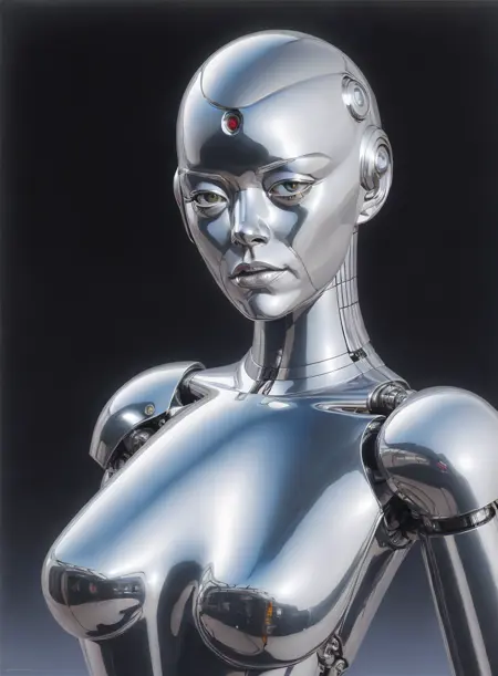 它相当敏感,需要进行实验调整。例如,在Sorayama的真实作品中,偶尔会露出真实的 flesh 脸庞,从铬金属中若隐若现。如果你想要这种效果,可以尝试降低强度(大约0.25?0.4?)。
