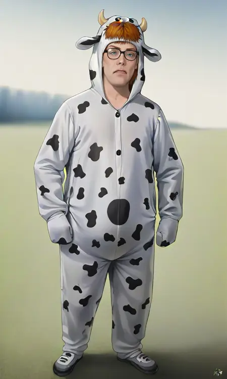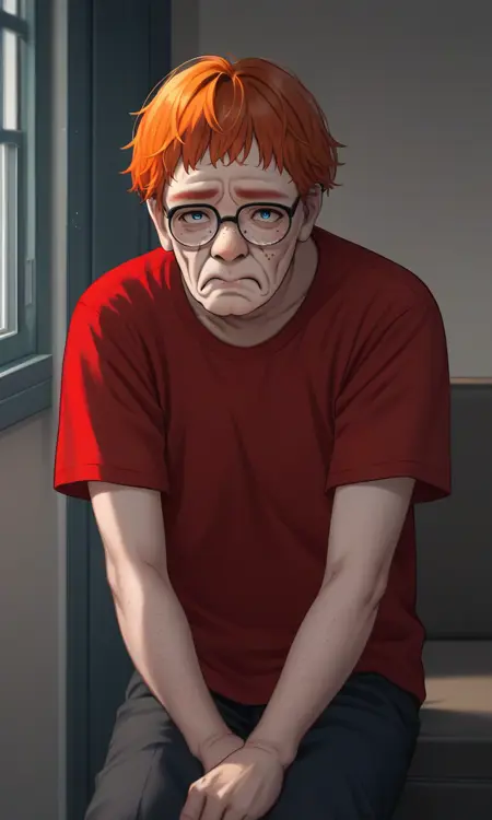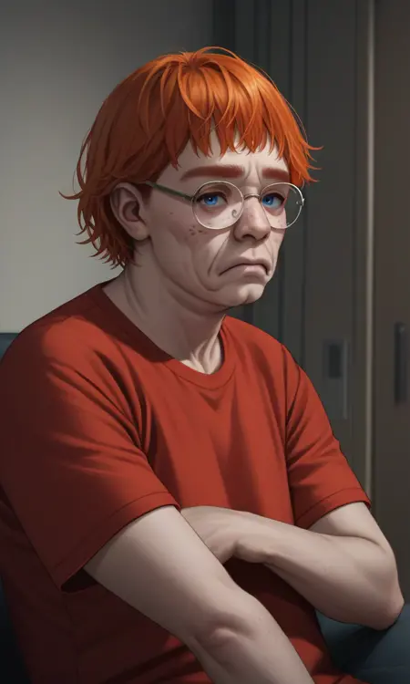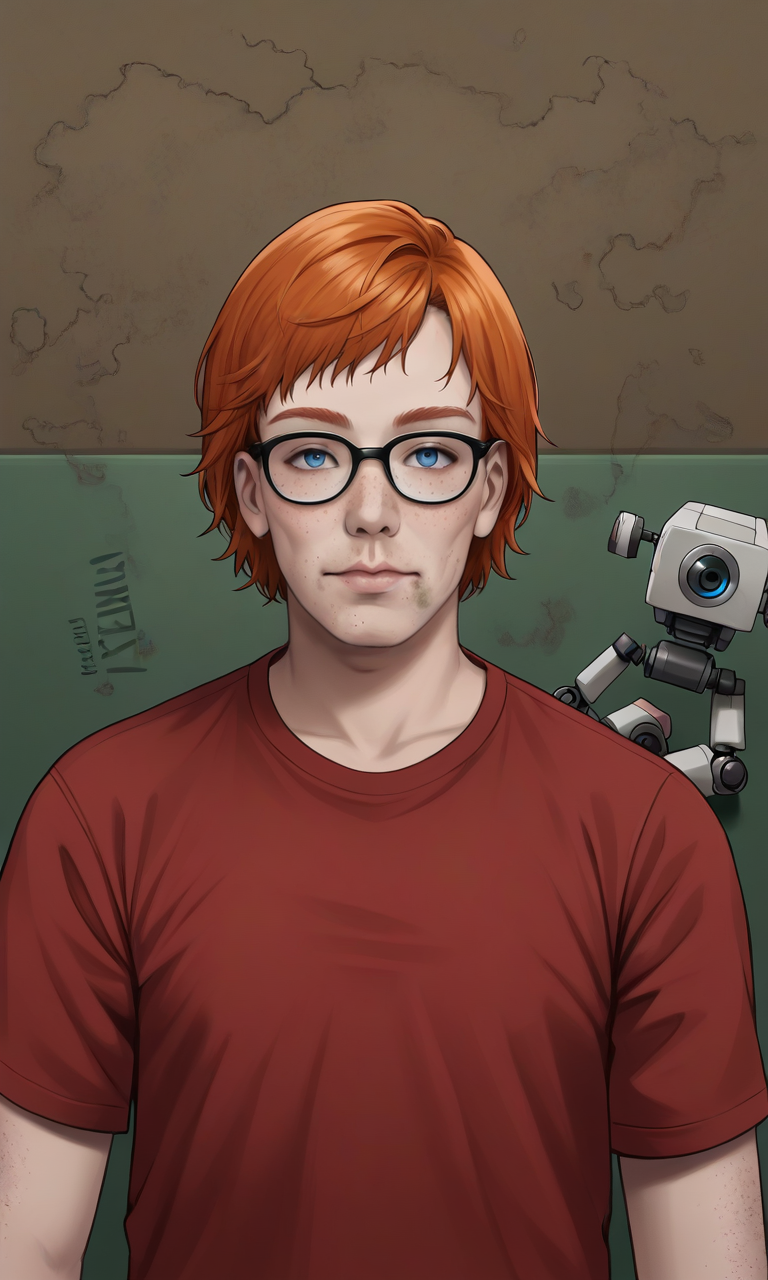 1man,ugly face,skinny, glasses, ginger bob hair,blue eyes, red t-shirt, freckled face