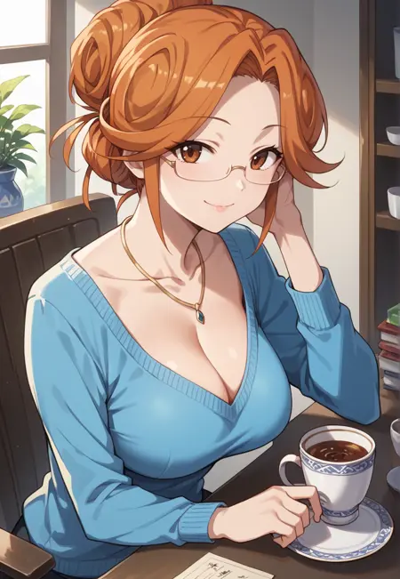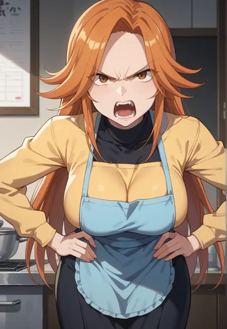 긴 머리, 주황색 머리, 갈색 눈, 큰 가슴복장