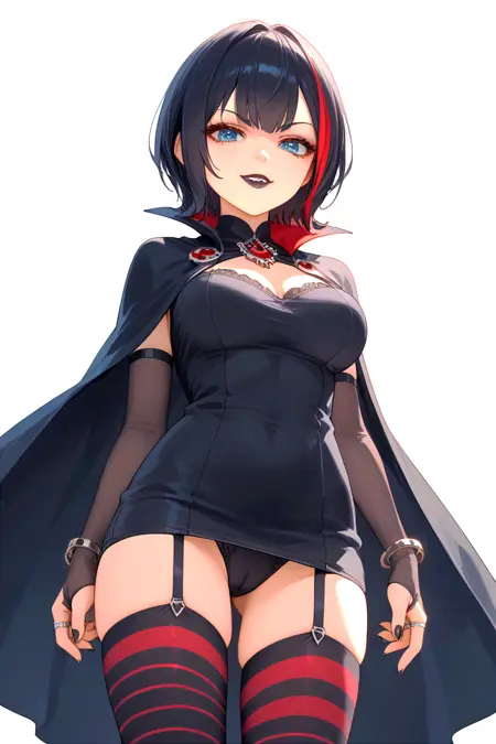- 连裤袜,连衣裙,条纹,条纹连裤袜,黑色连衣裙,红色鞋子,指甲油,化妆,红色连裤袜,裙子,鞋子,手套,斗篷,吸血鬼,珠宝,手镯,短裙,黑色斗篷,黑色连衣裙