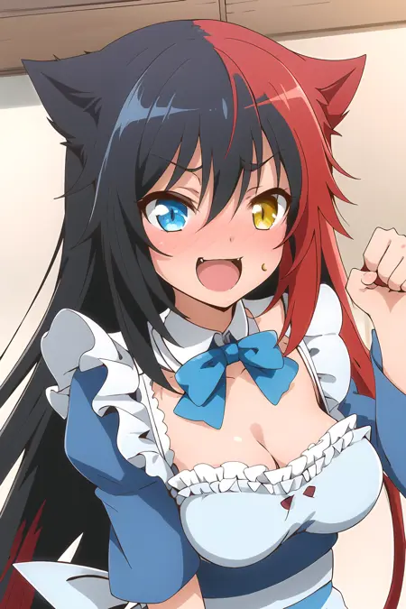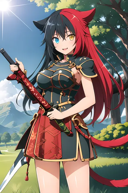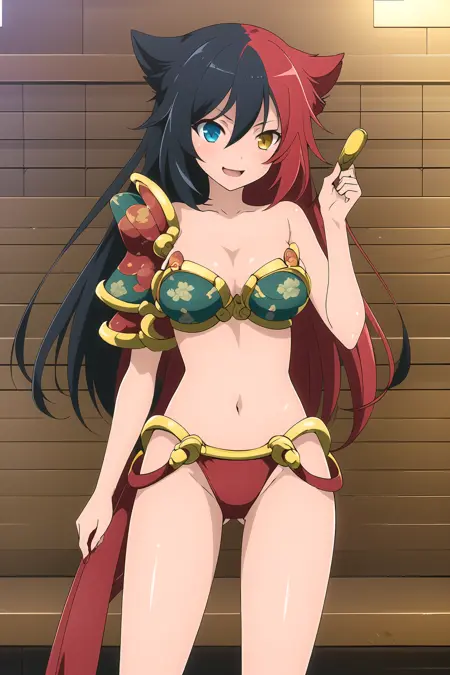 cat ears, tail, long hair, bikini armor, heterochromia, multicolored hair