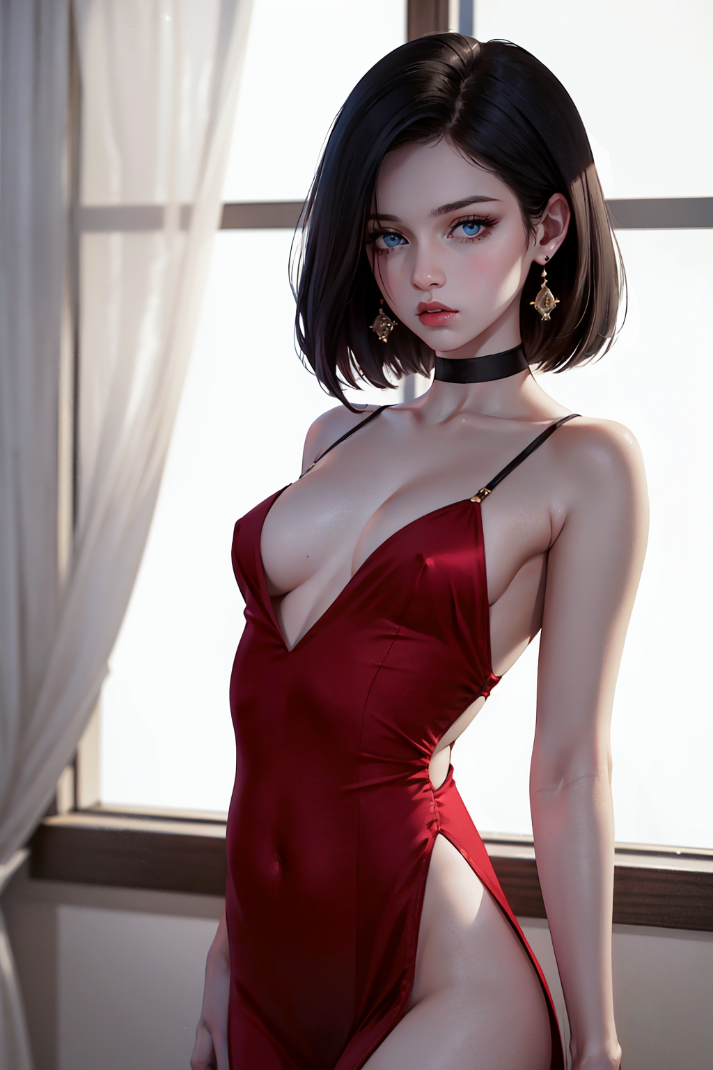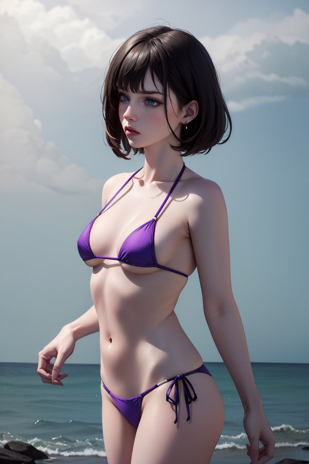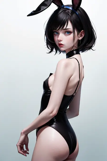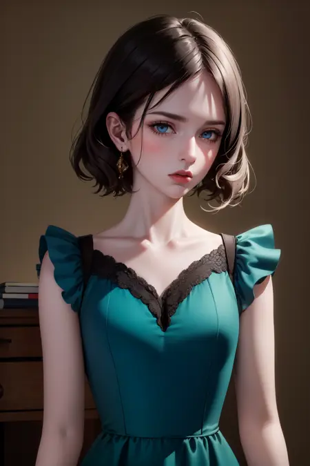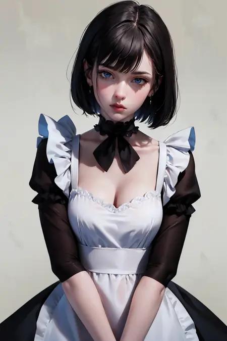 Use tags: 1girl, solo, kellybody, black hair, blue eyes, short hair, jewelry, necklace