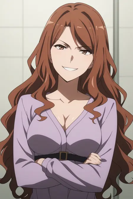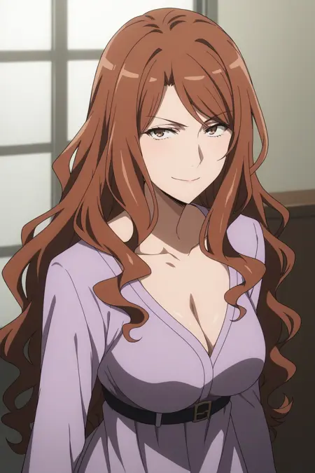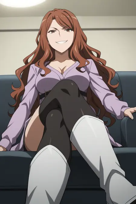 무기노 시즈리, 긴 머리, 파마머리, 갈색 머리, 갈색 눈, 드레스, 짧은 드레스, 보라색 드레스, 긴 소매, 갈비뼈, 가슴 부분, 벨트, 검은 허벅지 스타킹, 절대 영역, 흰색 신발, 하이힐 부츠