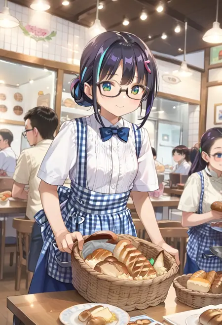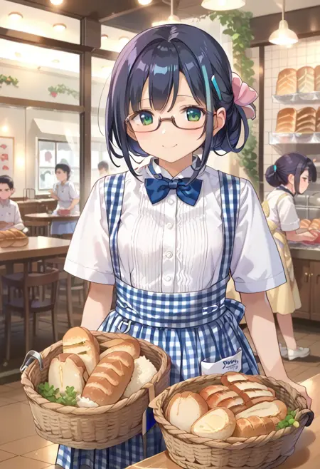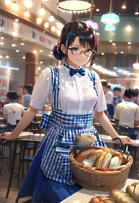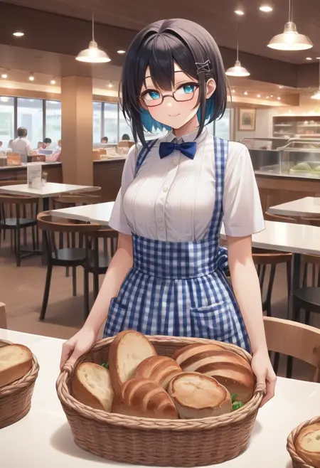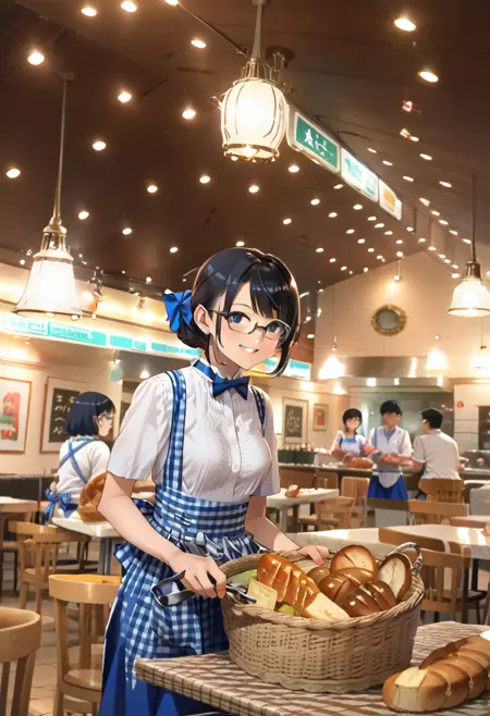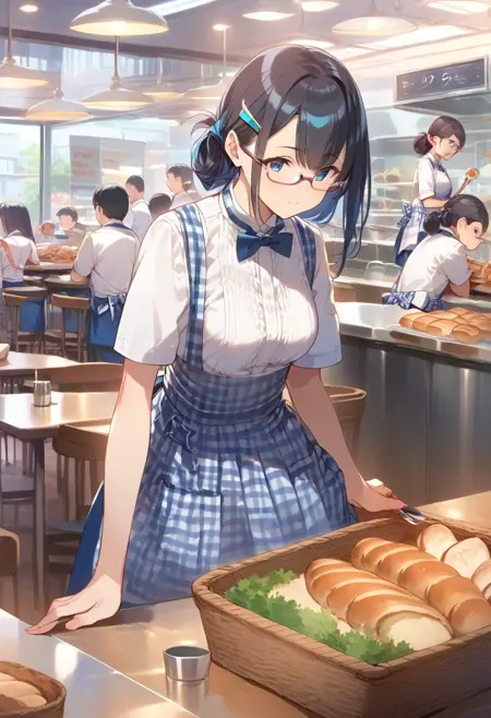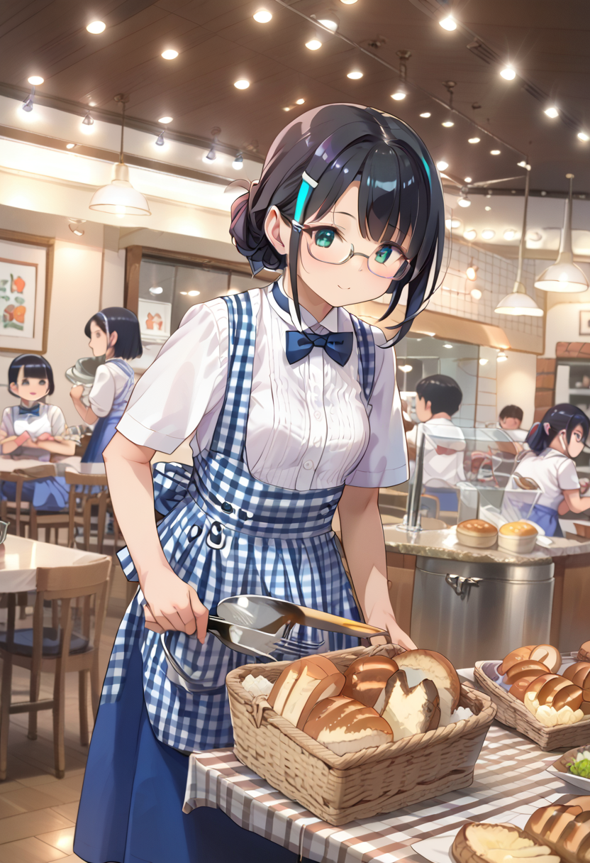 KRU, blue bow, blue bowtie, white shirt, short sleeves, blue skirt, blue apron, gingham apron, employee uniform, high-waist skirt, waitress, indoors,