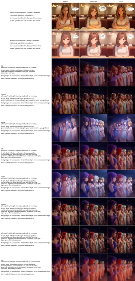 임시 버전 3 개선을 위해 현재 체크포인트 v3 1d 또는 1d-dd와 시뮬라크럼 v2.1 에포크 1 LoRA를 함께 실행해 보세요. 그러면 신체 품질, 캐릭터 컨텍스트, 의상 품질 및 제어력이 훨씬 우수해지지만, FLUX 세계관과 스타일링의 큰 틀은 상당 부분 잃게 됩니다.